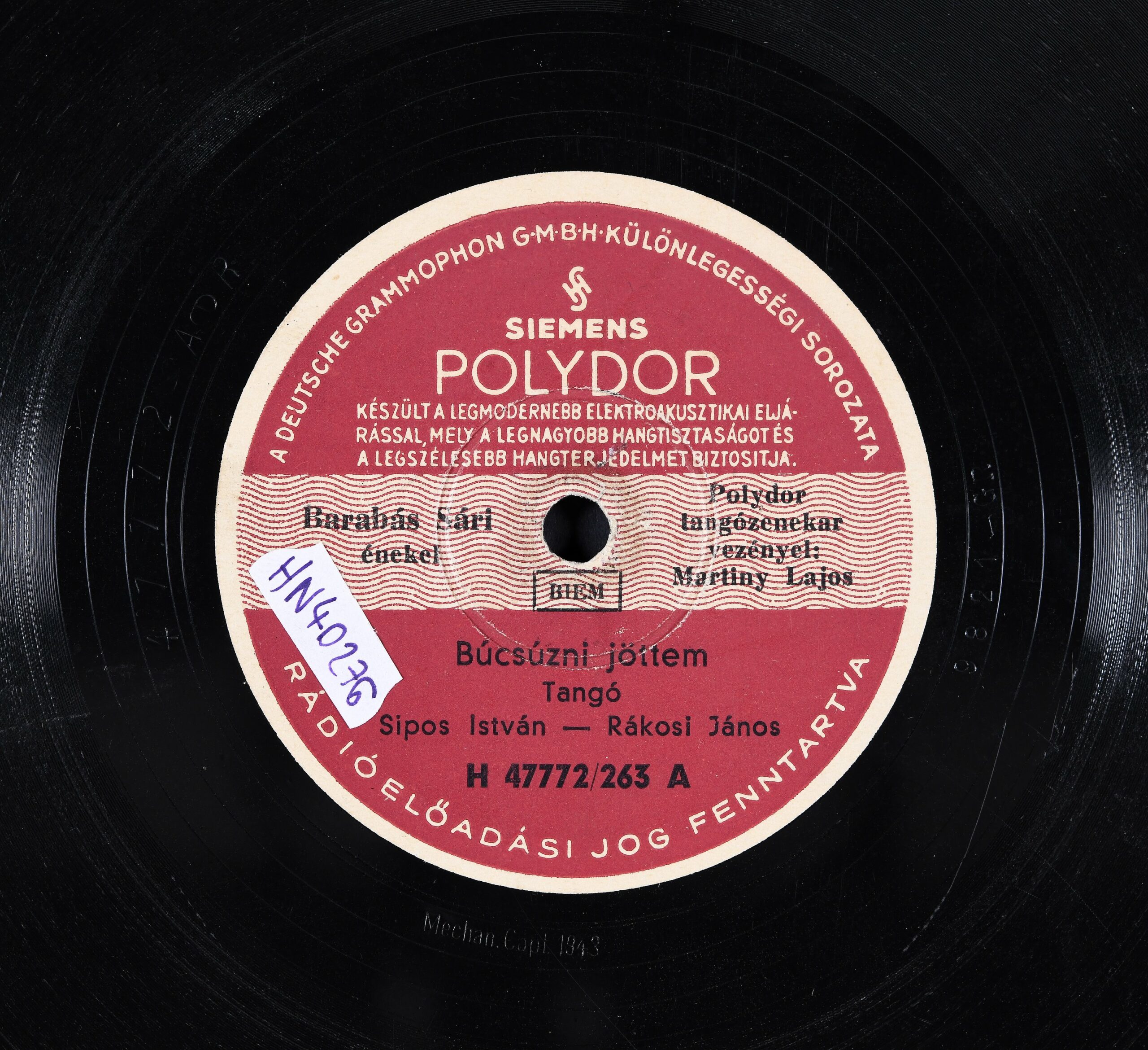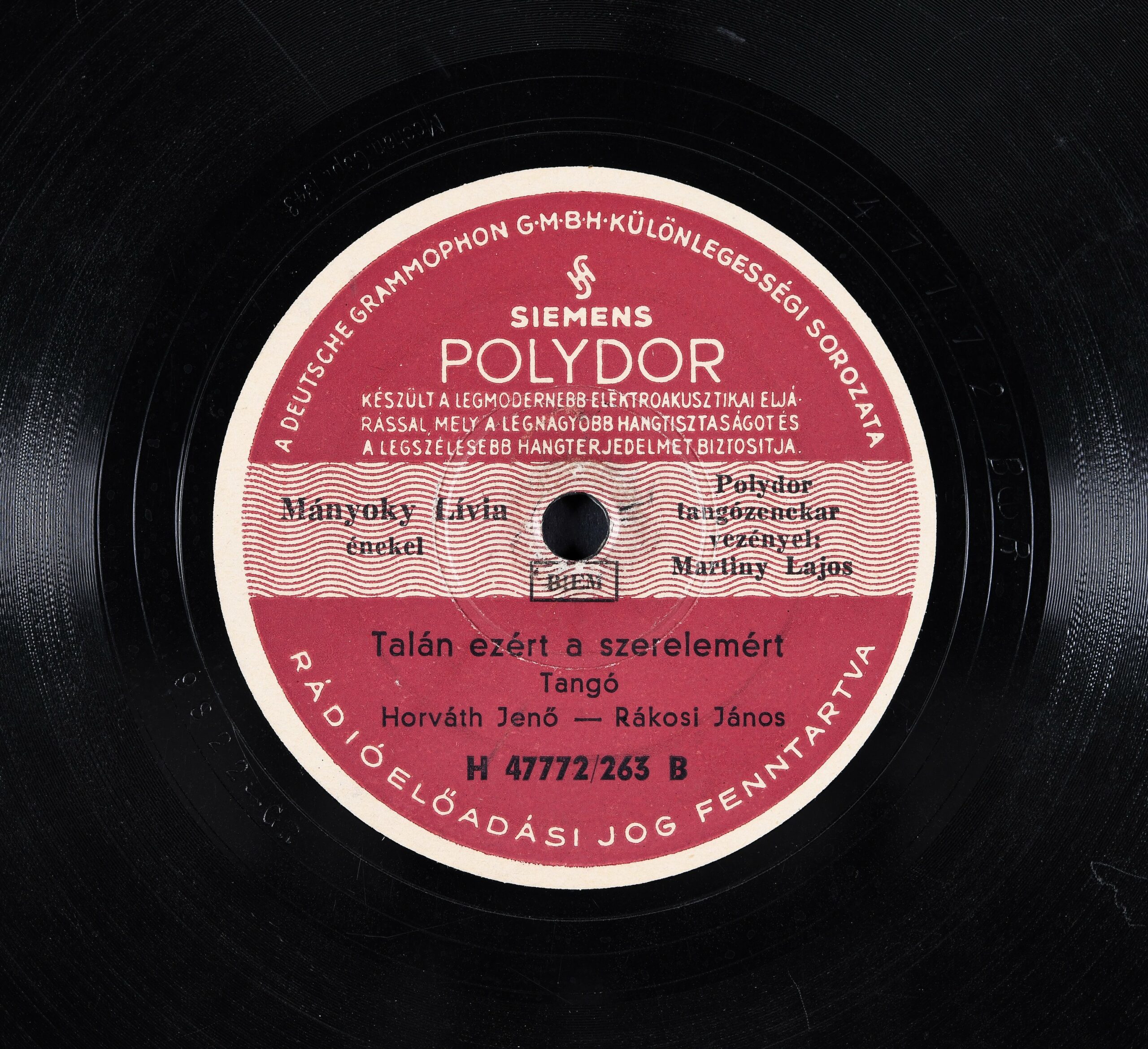 Előadja: [1.] Barabás Sári énekel ; Polydor tangózenekar ; vezényel: Martiny Lajos. [2.] Mányoky Lívia énekel ; Polydor tangózenekar ; vezényel: Martiny Lajos